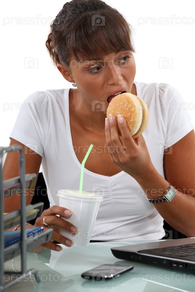 Голодная бизнес-леди ест гамбургер