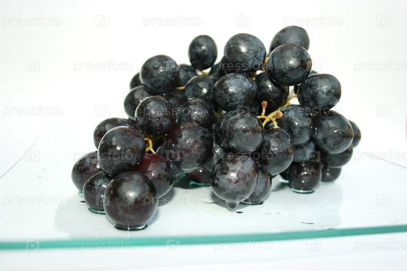 Черный виноград с каплями воды на тарелке