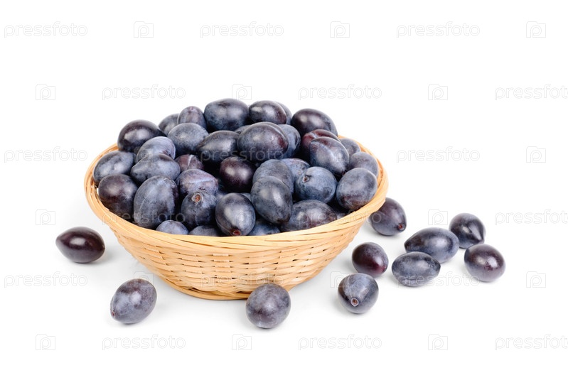 Свежие синие сливы в корзине на белом фоне