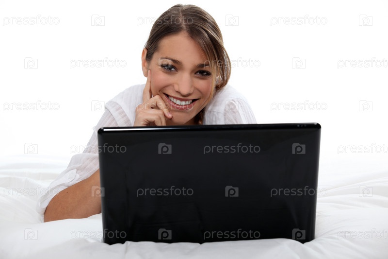 Брюнетка с ноутбуком лежит в постели
