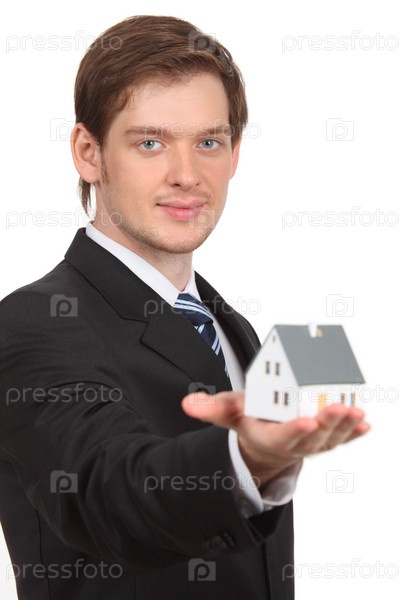Молодой человек держит дом на ладошке