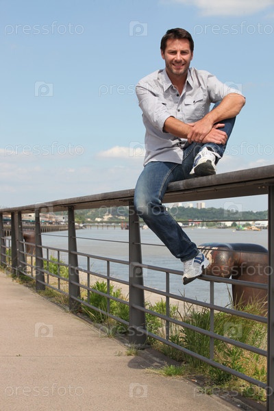 Мужчина сидит на перилах на берегу реки