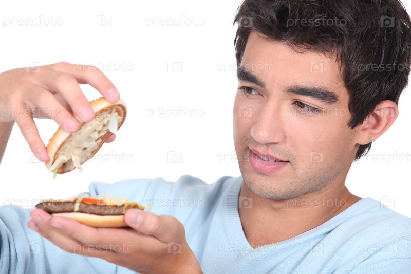 Мужчина открывает гамбургер