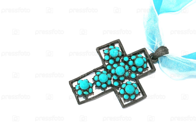 Металлический крест с голубыми камешками на ленточке на белой фоне