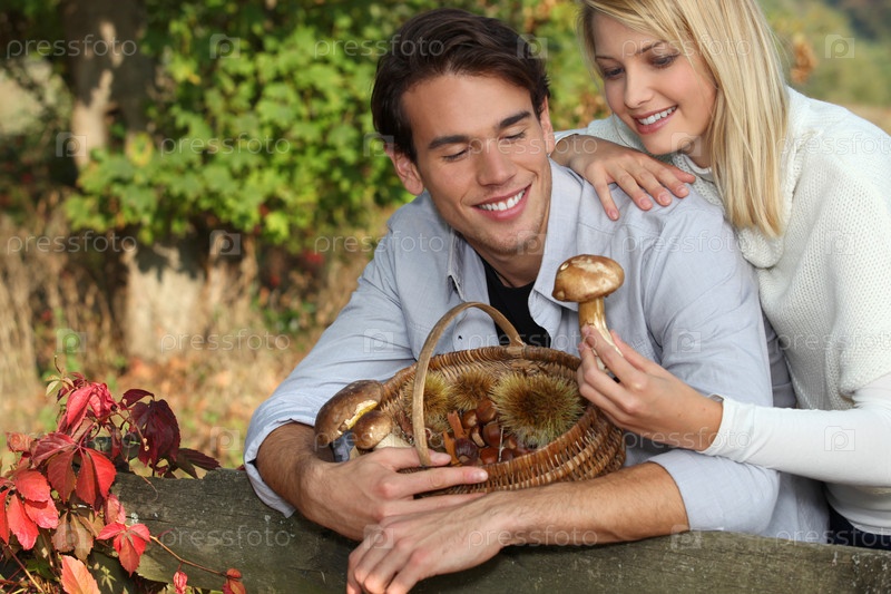 Молодая пара собирает грибы