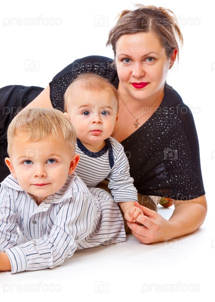 Мать с двумя мальчиками на белом фоне