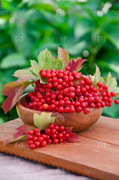 Красные ягоды калины в деревянной миске