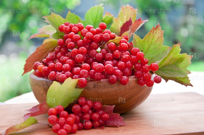 Красные ягоды калины в деревянной миске