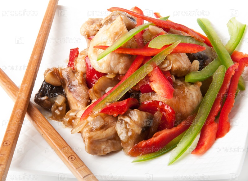 Жареный цыпленок со сладким стручковым перцем и грибами