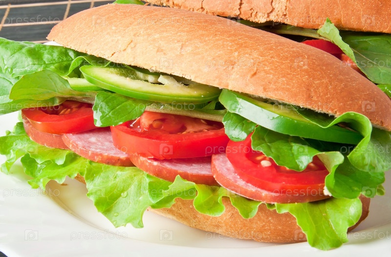 Сэндвич с ветчиной, помидором, огурцом и рукколой