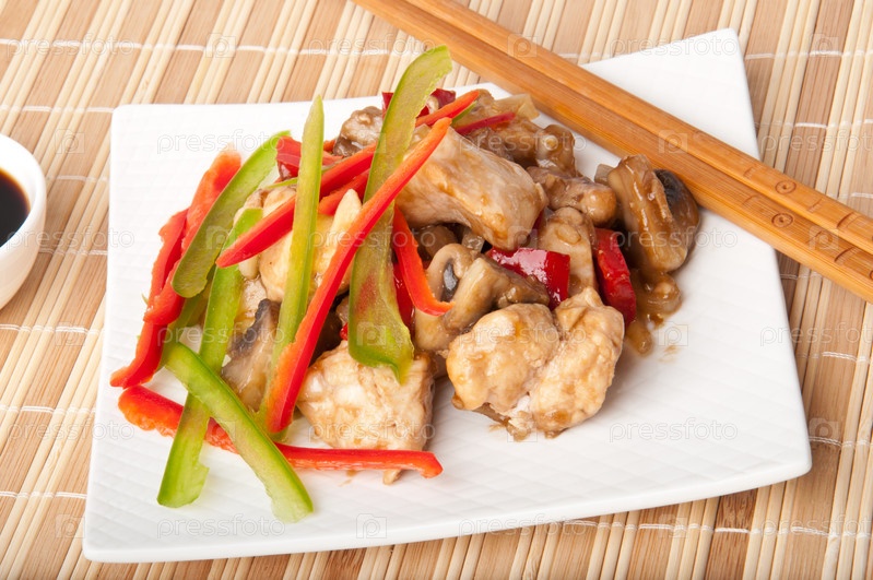 Жареный цыпленок со сладким стручковым перцем и грибами