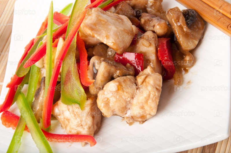 Жареный цыпленок со сладким стручковым перцем и грибами