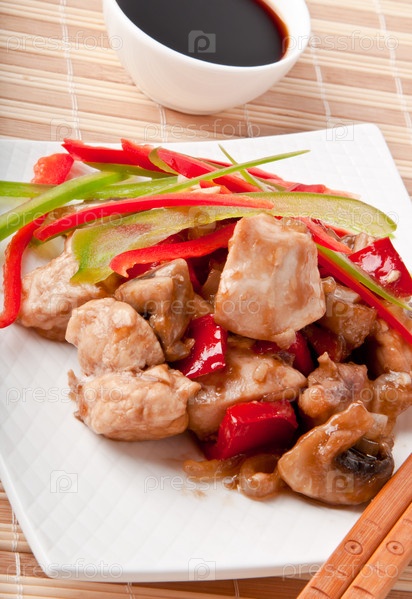 Жареный цыпленок со сладким стручковым перцем и грибами