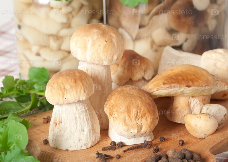 Грибы на деревянной разделочной доске, специи, масло и ложка