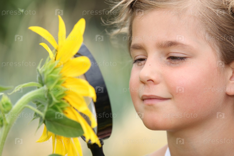 Ребенок изучает подсолнечник с увеличительным стеклом