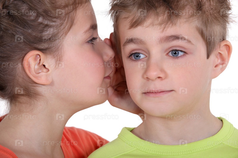 Маленькая девочка шепчет секрет на ухо маленького мальчика