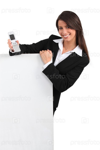 Молодая женщина в костюме с пустым баннером для вашего сообщения