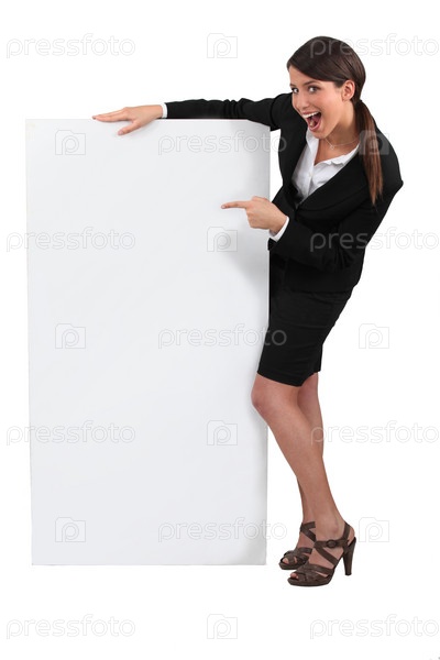 Молодая женщина в костюме с пустым баннером для вашего сообщения