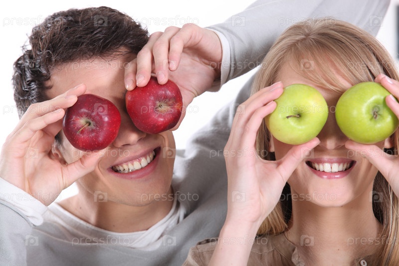 Мужчина и женщина, закрывающие глаза яблоками