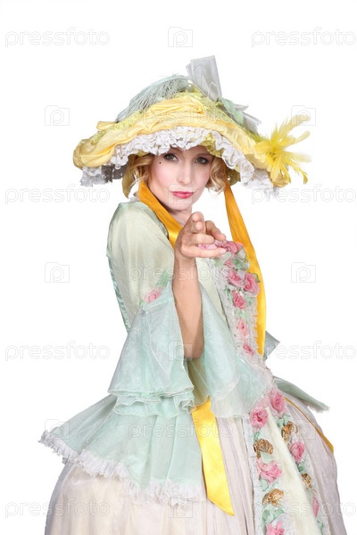 Женщина в театральном наряде с пальцами в виде пистолета