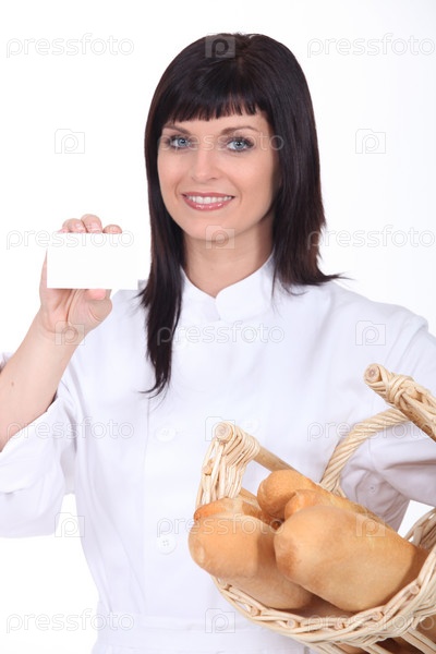 Женщина-пекарь с корзиной хлеба и визиткой
