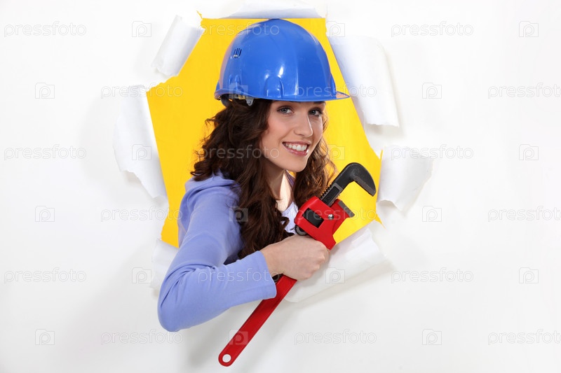 Женщина с гаечным ключом и в каске