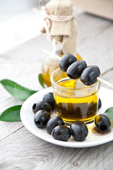 Тарелка с оливками и бутылка оливкового масла на деревянном фоне
