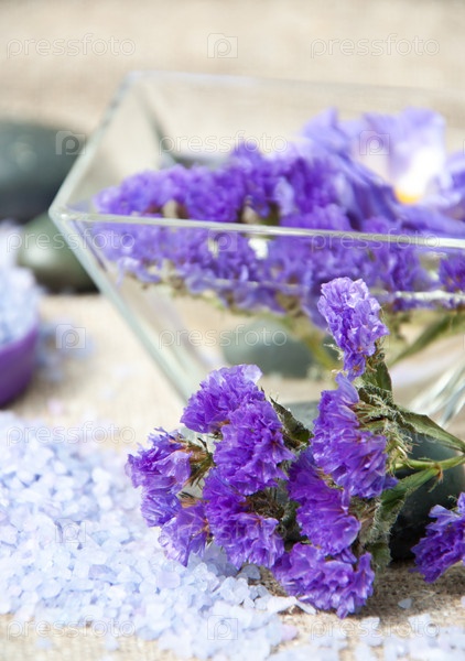 Концепция спа. Соли и фиолетовые цветы лаванды