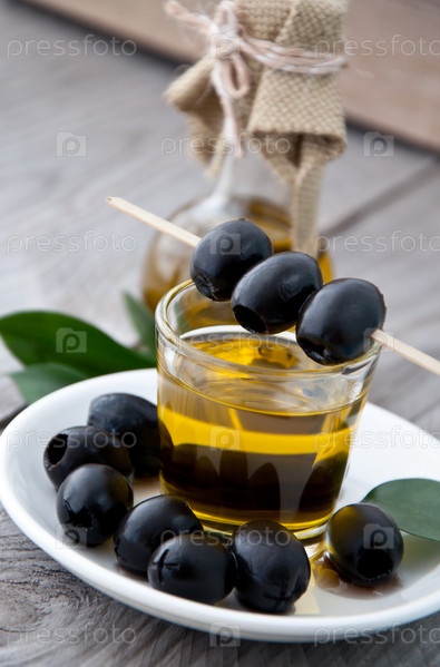 Тарелка с оливками и стакан оливкового масла на деревянном фоне