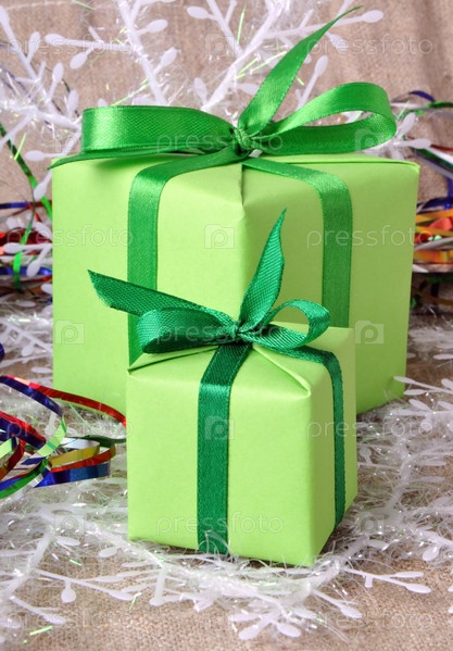 Небольшие подарки с зеленым бантом на светлом фоне