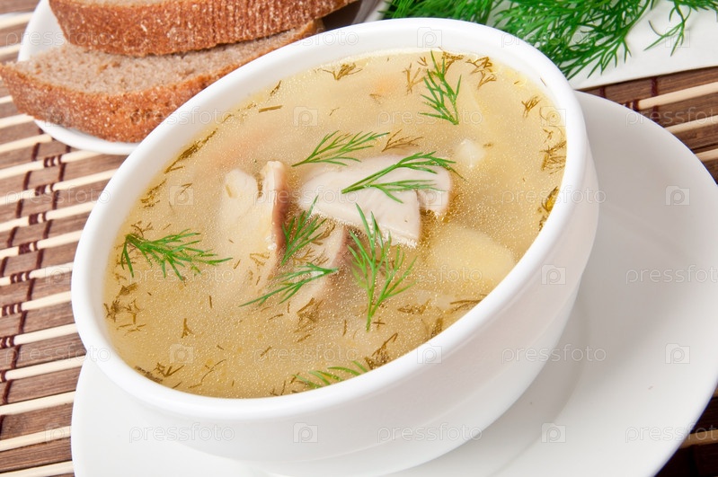 Грибной суп, украшенный свежим укропом