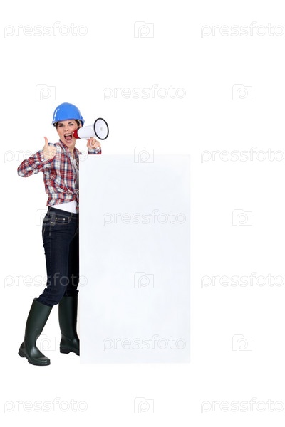 Женщина-строитель с мегафоном и доской для объявления