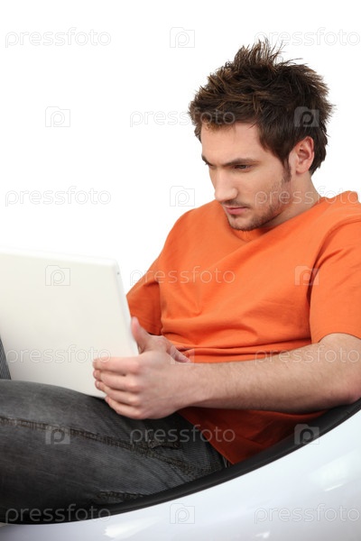 Хмурый мужчина с ноутбуком