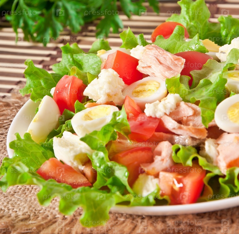 Свежий салат с лососем, листьями салата и перепелиными яйцами