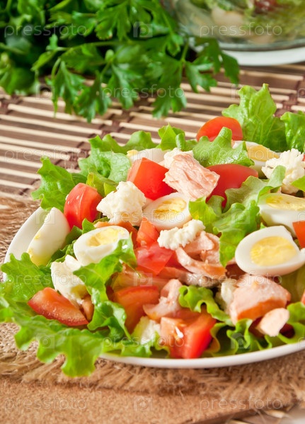 Свежий салат с лососем, листьями салата и перепелиными яйцами