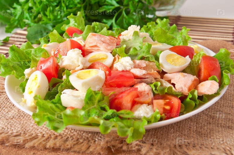 Свежий салат с лососем, листьями салата и перепелиными яйцами