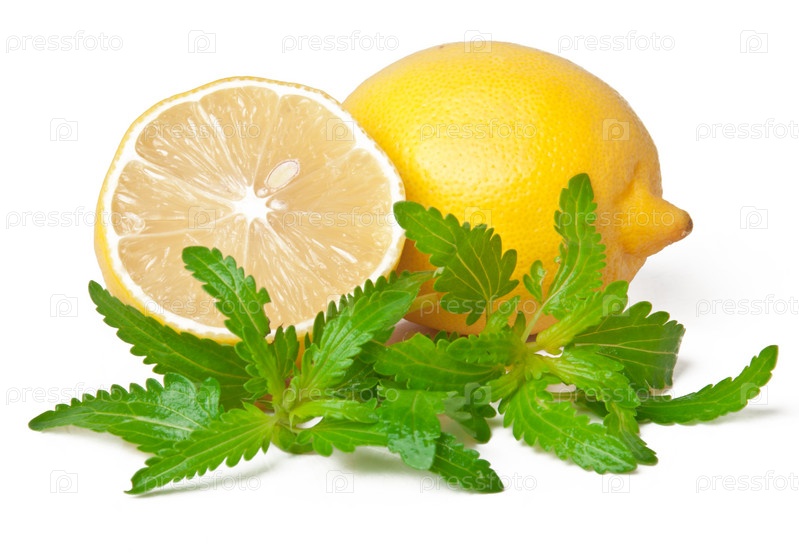 Желтый лимон с мелиссой на белом фоне