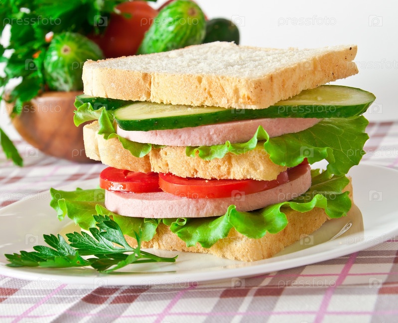 Свежий вкусный бутерброд на белом фоне