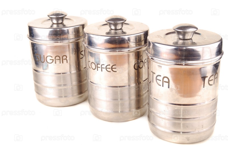 Металлические емкости для сахара,кофе и чая на белом фоне