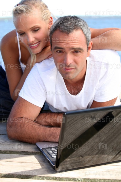 Пара с ноутбуком на причале