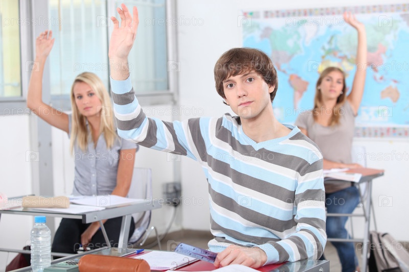Студенты с поднятыми руками в классе