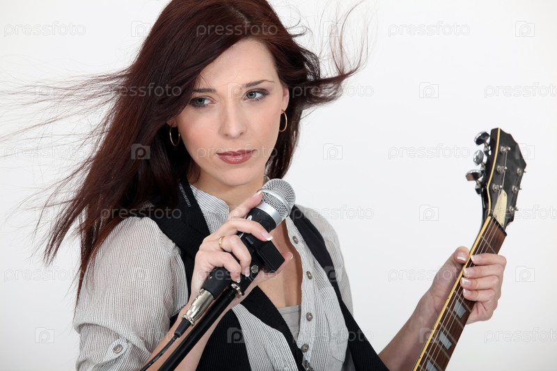 Женщина с электрической гитарой и микрофоном