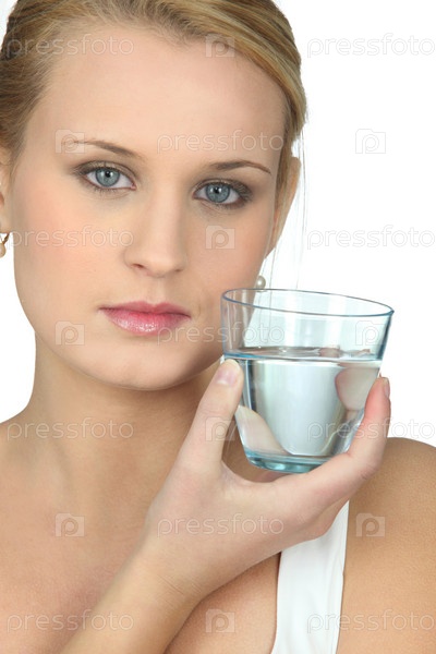 Серьезная женщина с стаканом воды в руке