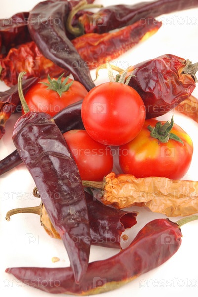 Острый красный перец и помидоры на белом фоне