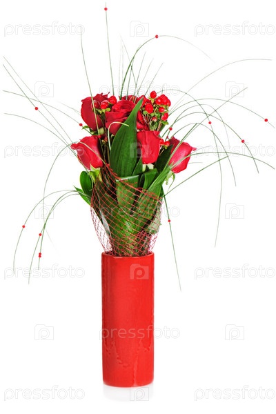 Красочный букет из красных роз в красной вазе, изолированный на белом фоне