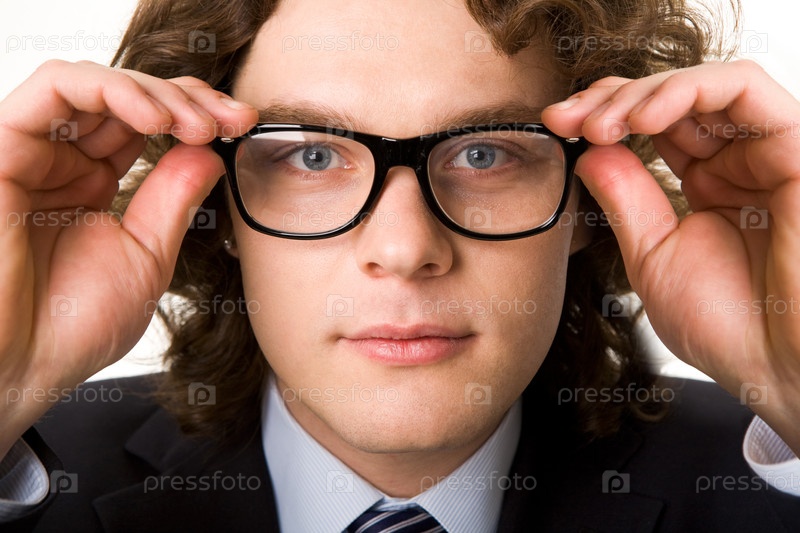 Близкий план красивого бизнесмена, который смотрит на камеру через очки