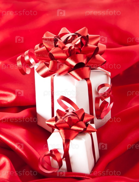Небольшие подарки с красным бантом на красном фоне