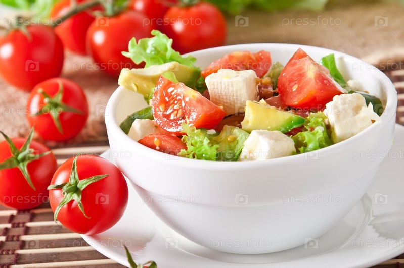 Салат с авокадо, черри и моцареллой с медово-мясной заправкой