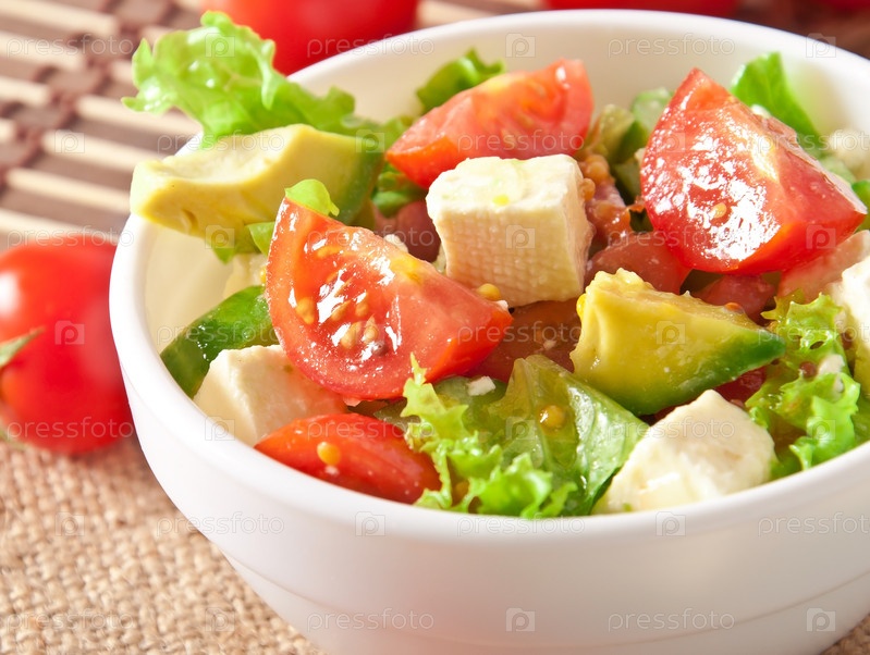 Салат с авокадо, черри и моцареллой с медово-мясной заправкой