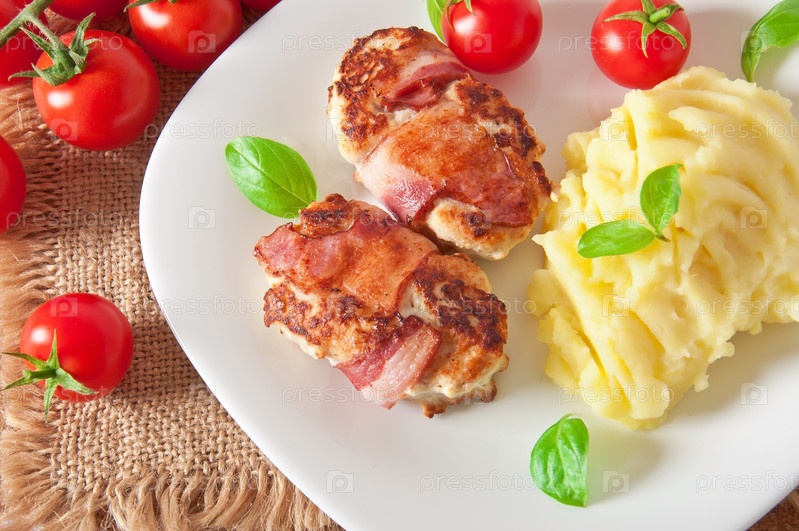 Куриные пирожки, завернутые в полоски бекона и картофельное пюре